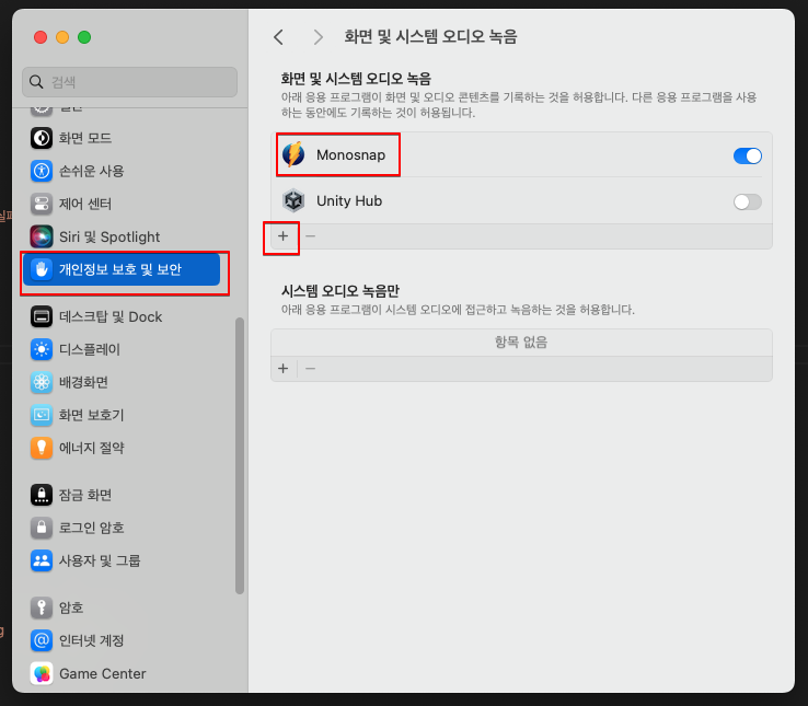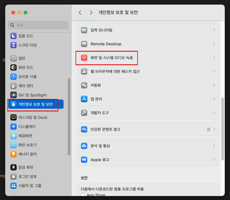 시스템설정 -> 개인정보 보호 및 보안 -> 화면 및 시스템 오디오 녹음